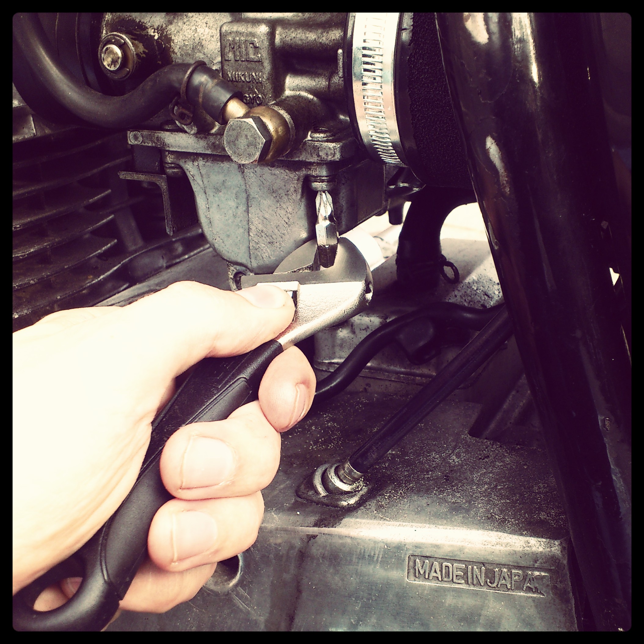 To dager senere kjikket eg ned under sete for å justere på tomgangen. Da oppdaget eg at flere skruer under forgasseren var løse og måtte improvesere fram en kort skrujern. Men uansett hvor kreativ du kan være, er det best å ha det rette verktøyet. Neste kjøp: en multiverktøyskniv eller noe lignande.