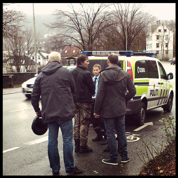 Eg ringte politiet: ” Hei, har dere lyst å ta han som stjal motorsykkelen min i natt?” Det hadde de. Med politiet på telefonen følgte eg etter fyren uten bli merket helt til en bil var like å nærheten. Narkisen kom seg til busstoppet, men politiet kom før bussen.